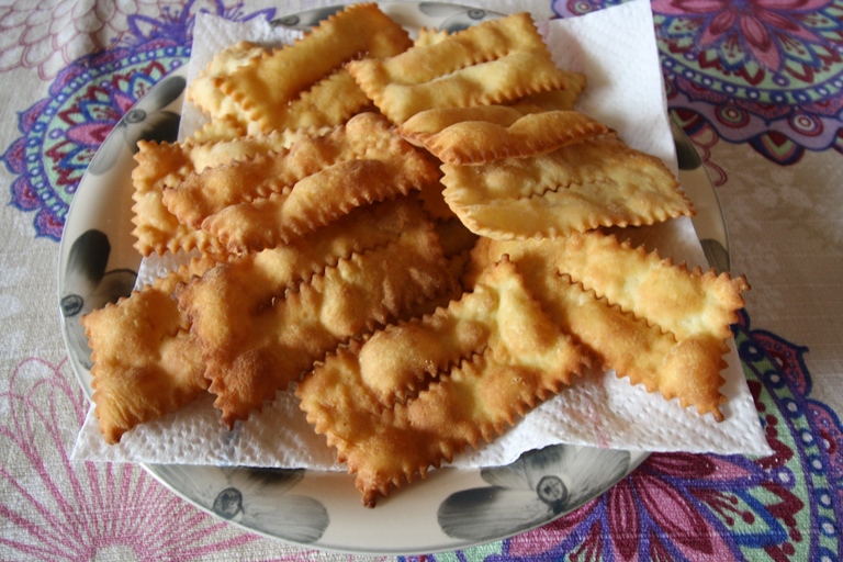 In alternativa, se volete percorrere una strada più salutare, potete disporre i rettangolini ottenuti dall’impasto su una teglia rivestita con carta da forno e cuocere le chiacchiere in forno già caldo a 180° per circa 15 minuti.